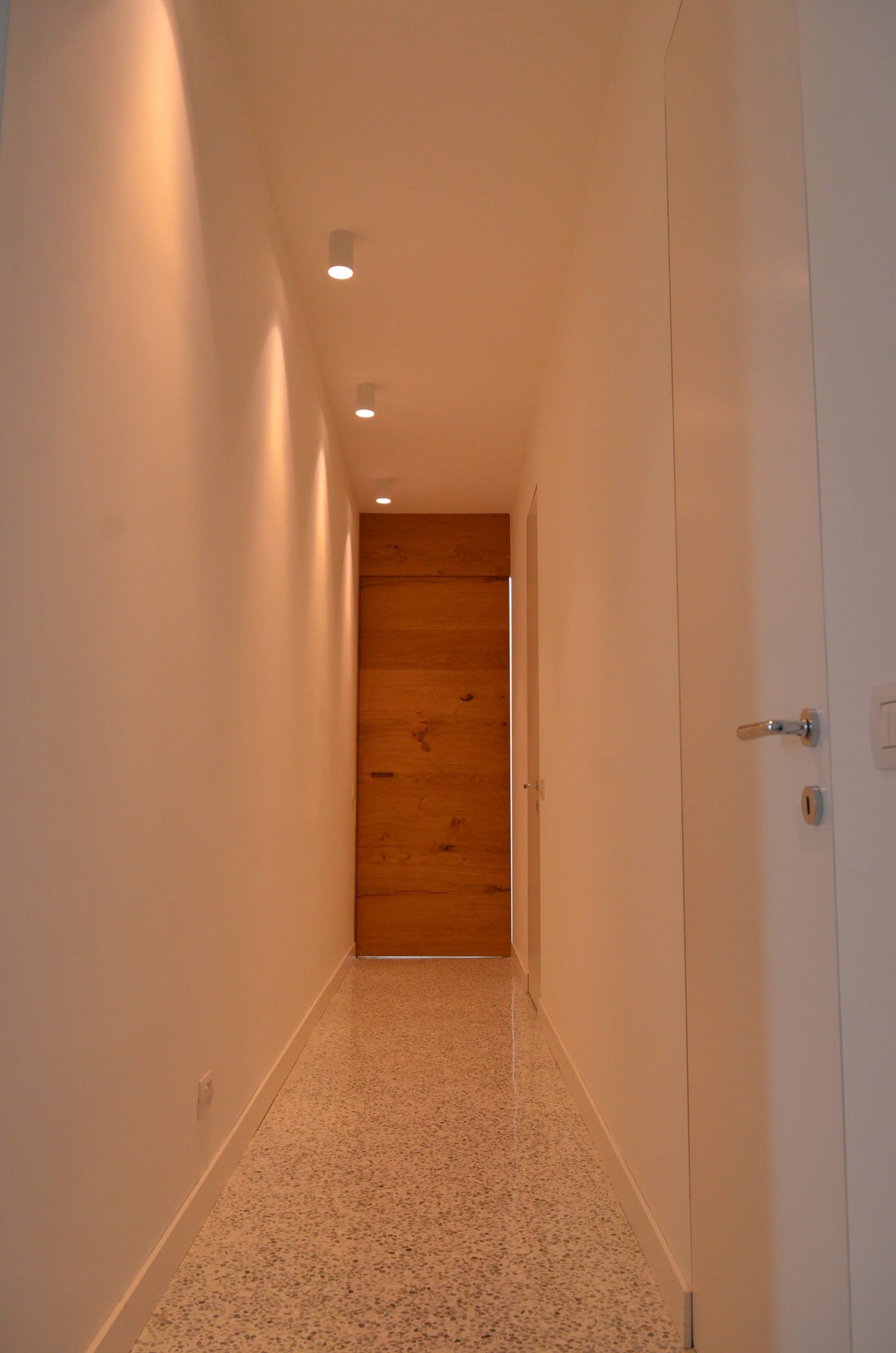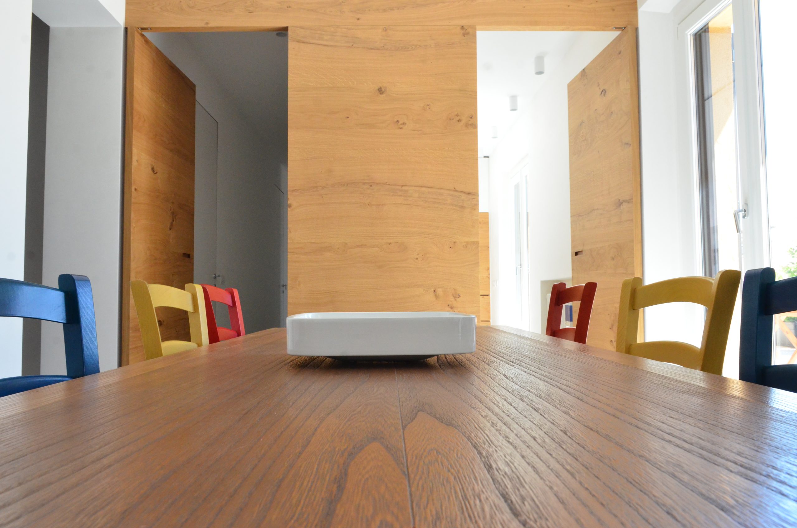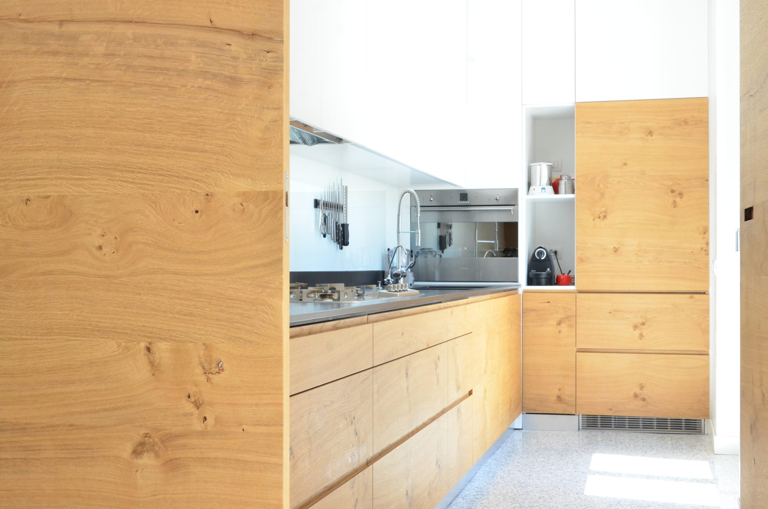 Il proprietario è un architetto che ha disegnato casa sua. La sua dimora si distingue per una parete in rovere che integra perfettamente due porte a filo, conducendo rispettivamente alla cucina e al corridoio. Questo elemento in legno aggiunge calore e naturalezza agli ambienti, creando un continuum visivo e stilistico.
