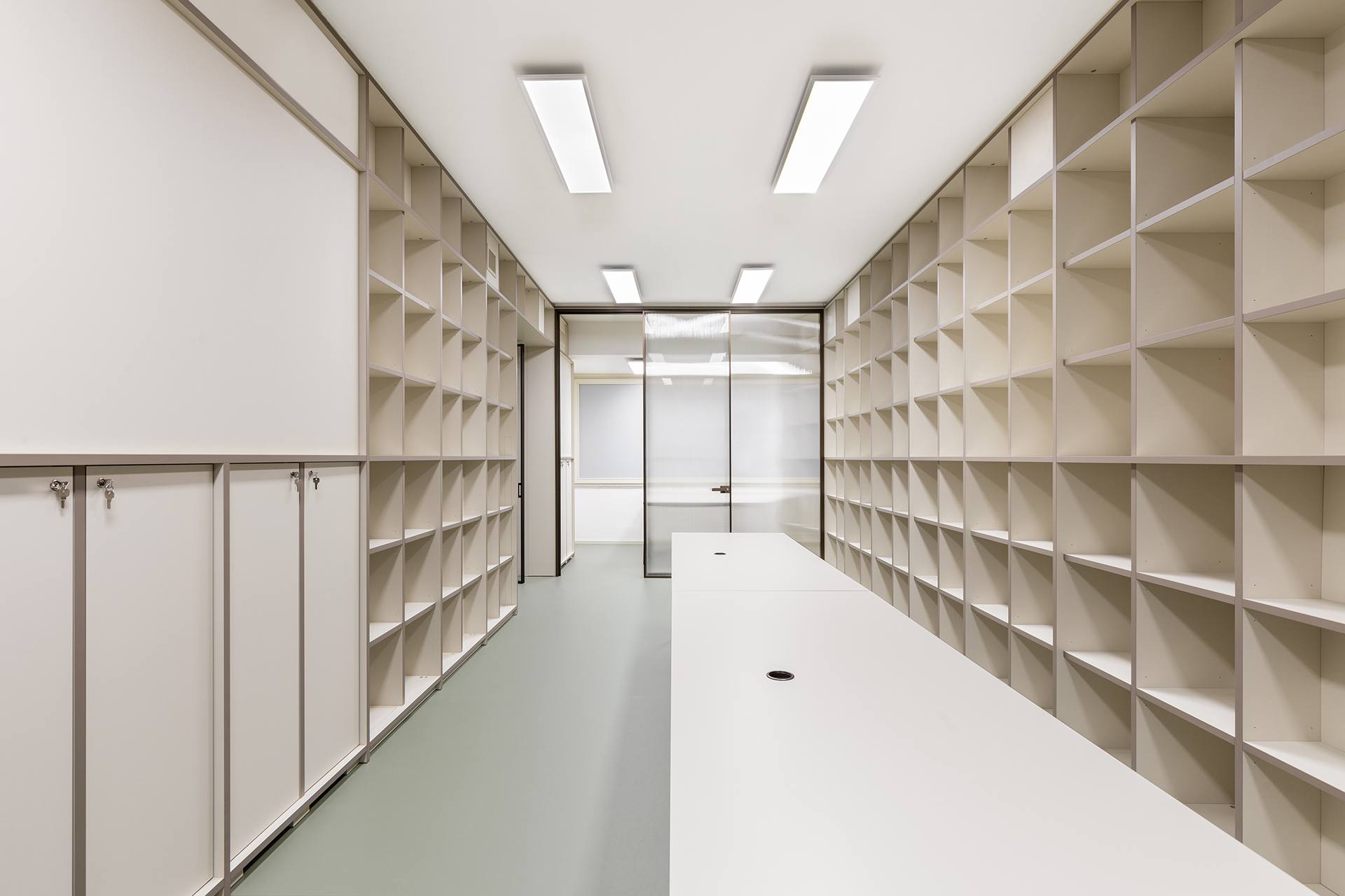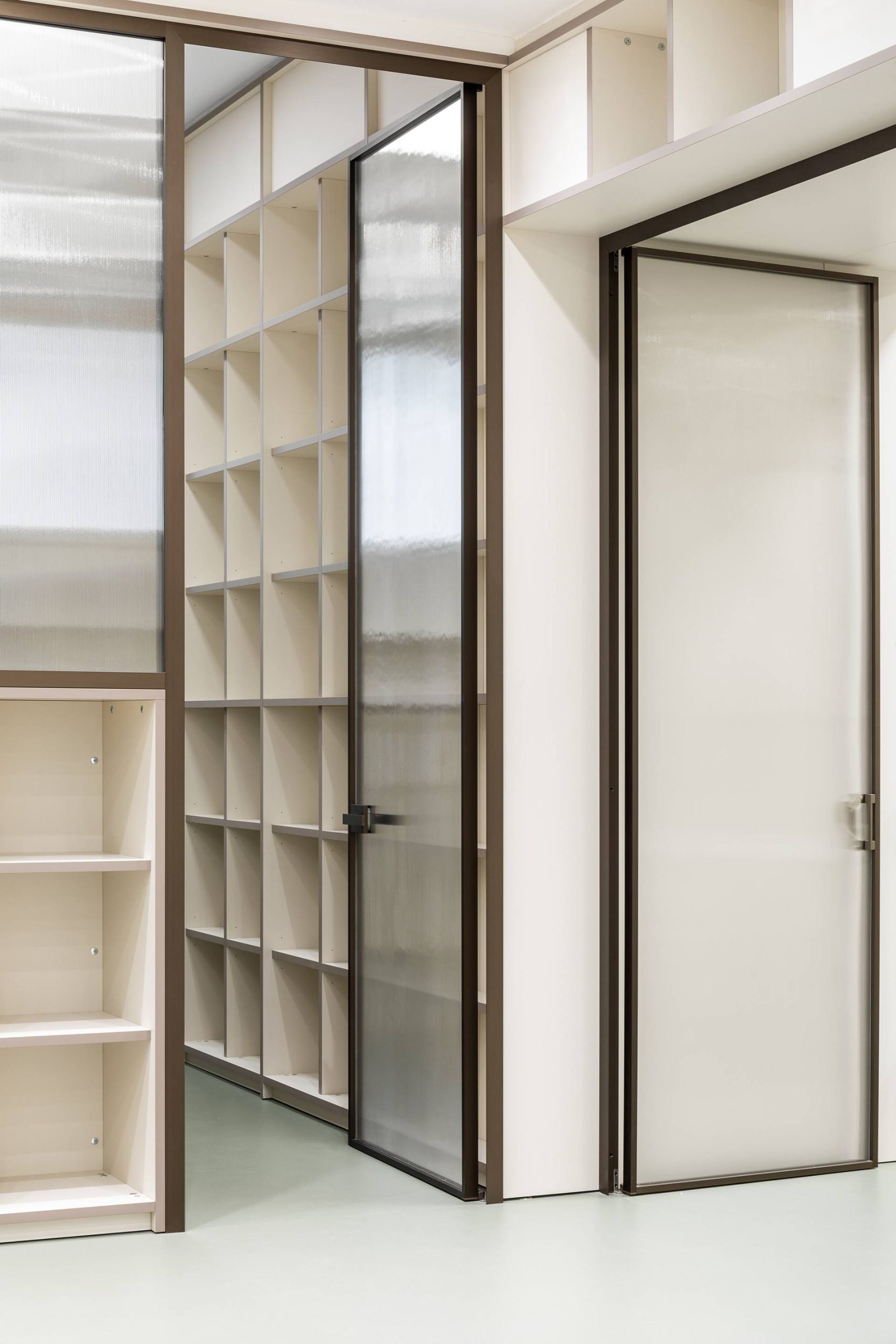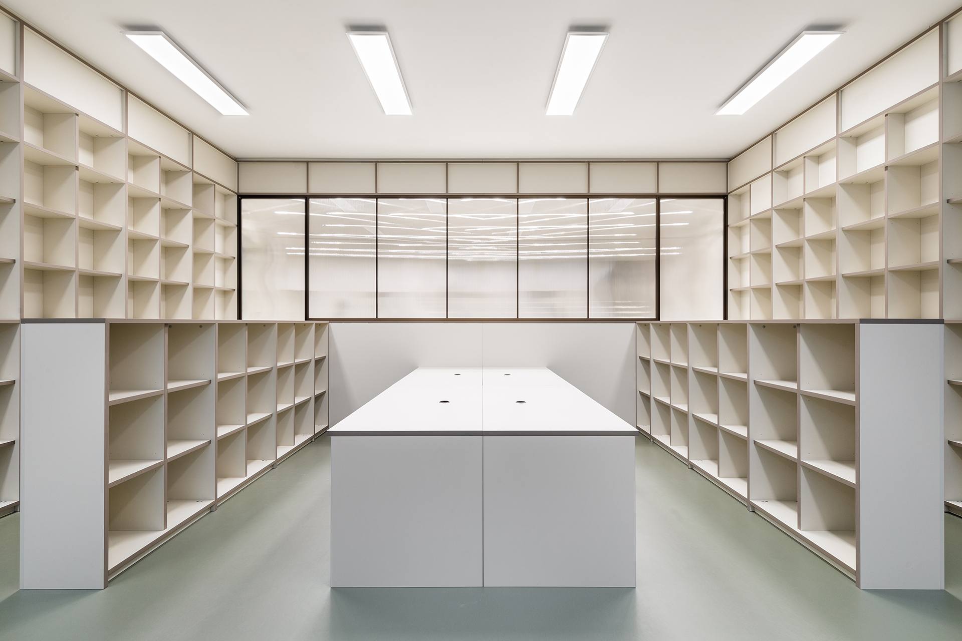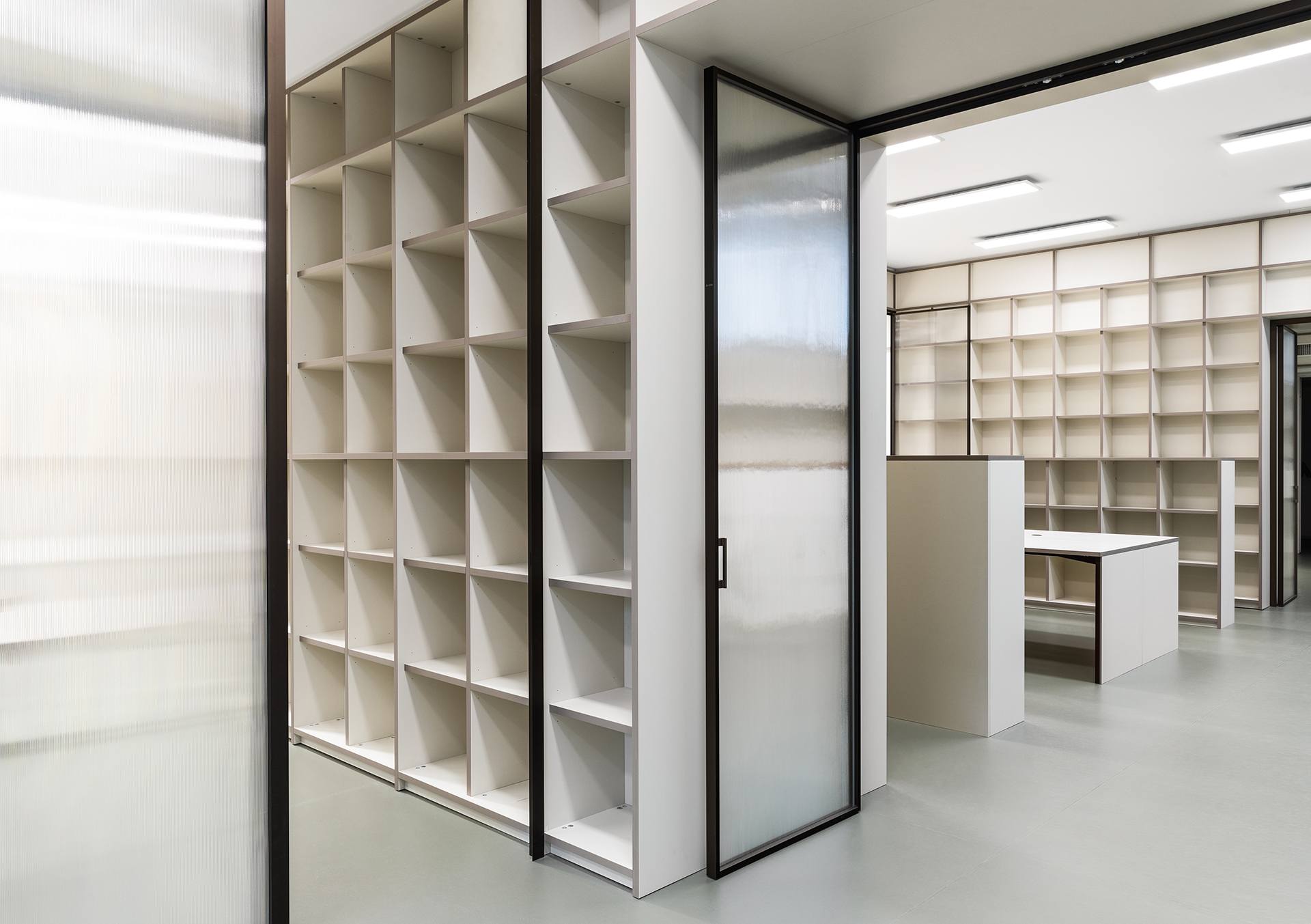 L’uso di materiali di alta qualità e il design accurato creano un’atmosfera accogliente e raffinata, ideale per una galleria d’arte. La combinazione di forme semplici e lineari con l’eleganza del multistrato laminato offre uno sfondo neutro ma sofisticato, perfetto per valorizzare le opere esposte.