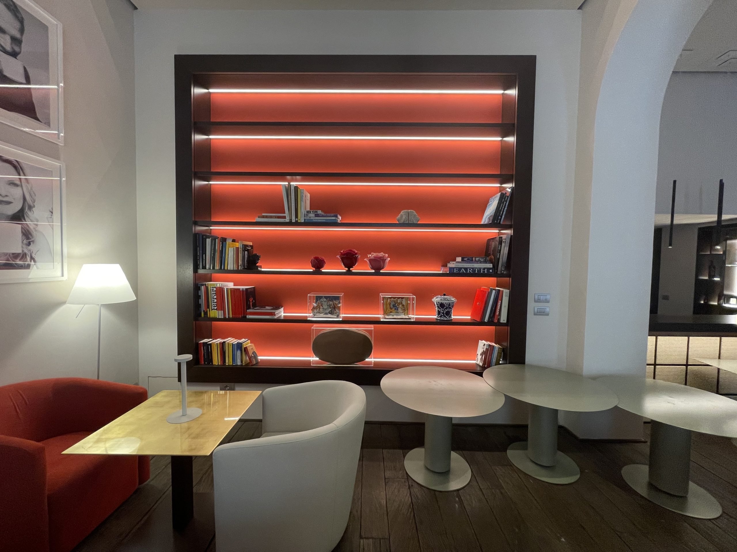 L’illuminazione LED sulle mensole da 3 metri non solo migliora la visibilità ma mette anche in risalto gli oggetti esposti, creando un punto focale attraente per gli ospiti. La combinazione di materiali di alta qualità e design innovativo assicura che l’hotel offra non solo bellezza estetica ma anche praticità e comfort.