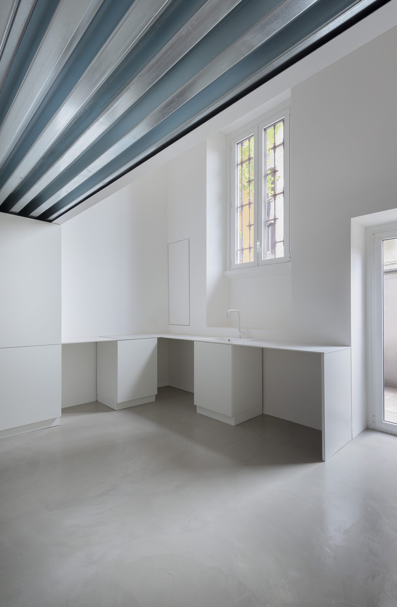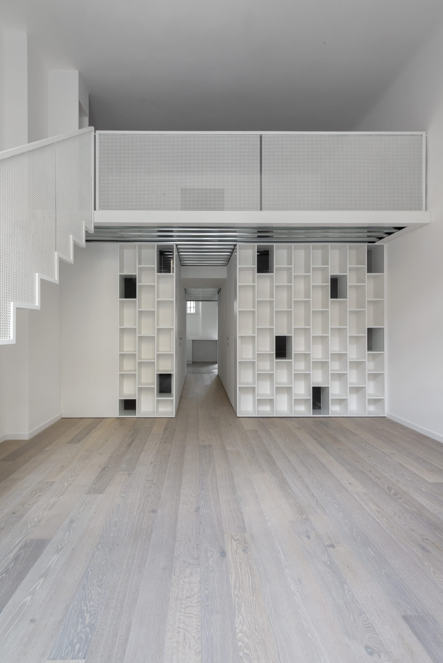 Il progetto prevede una libreria innovativa, caratterizzata da alcune parti degli schienali in vetro. Questa scelta di design permette alla luce di filtrare attraverso la libreria, mantenendo luminosi i locali situati dietro di essa. Gli schienali in vetro non solo aggiungono un elemento di leggerezza e trasparenza, ma creano anche un effetto visivo di continuità e apertura tra gli spazi.