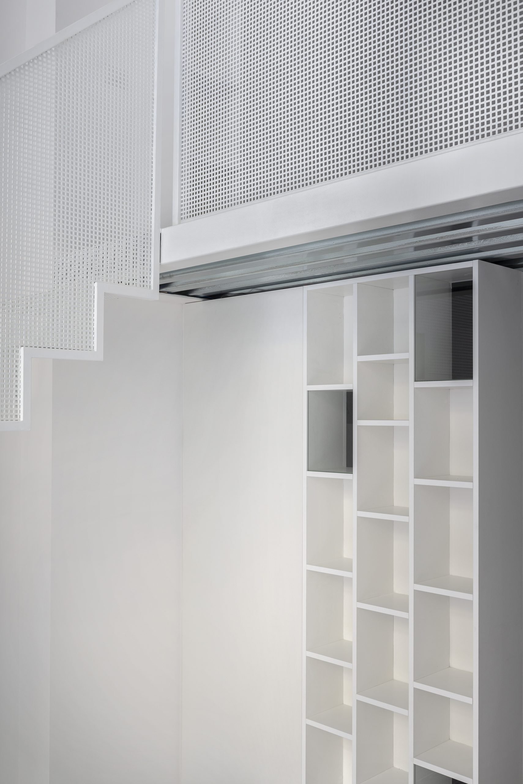 La libreria è progettata per essere un elemento di grande impatto visivo, senza compromettere la funzionalità degli spazi. Le parti in vetro degli schienali assicurano che la luce naturale possa passare liberamente, mantenendo luminosi gli ambienti adiacenti e contribuendo a un’atmosfera accogliente e ariosa. La combinazione di vetro e nobilitato bianco crea un contrasto elegante, aggiungendo un tocco di raffinatezza all’ambiente.